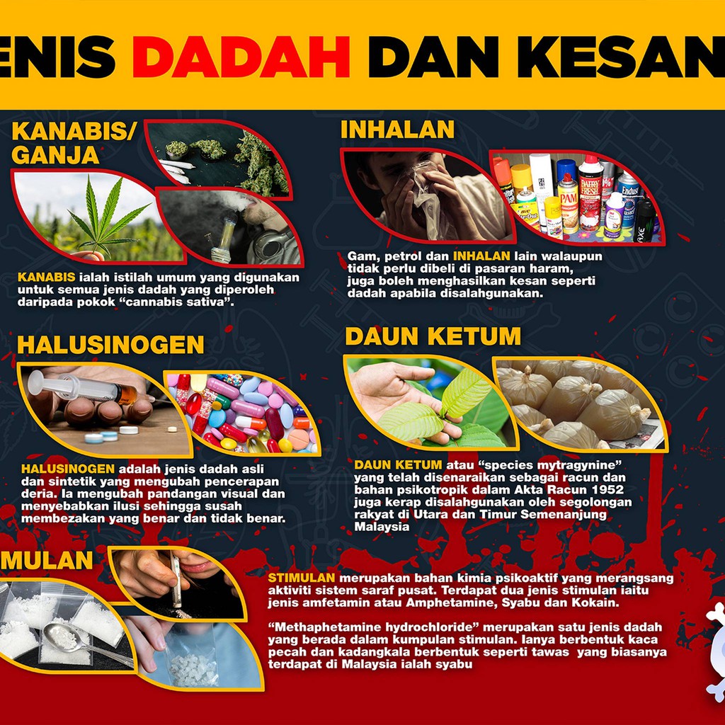 Kesan Dan Bahaya DadahSedikit informasi tentang kesan dan bahaya dadah yang sering disalahgunakan sehingga merosakkan agama bangsa dan negara tercintaAntar. Jenis dadah seperti seperti kokain ganja heroin syabu dan ecstasy diambil untuk mengubah perasaan fikiran anda. JENIS PENAGIHAN SEMULA RELAPS.